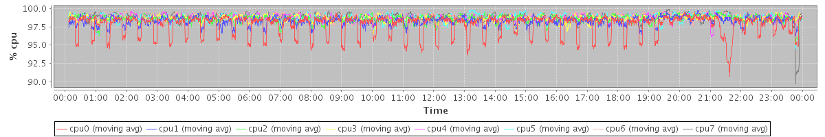 avg(cpu0) = 97.77 avg(cpu1) = 98.32 avg(cpu2) = 98.61 avg(cpu3) = 98.62 avg(cpu4) = 98.70 avg(cpu5) = 98.76 avg(cpu6) = 98.80 avg(cpu7) = 98.78