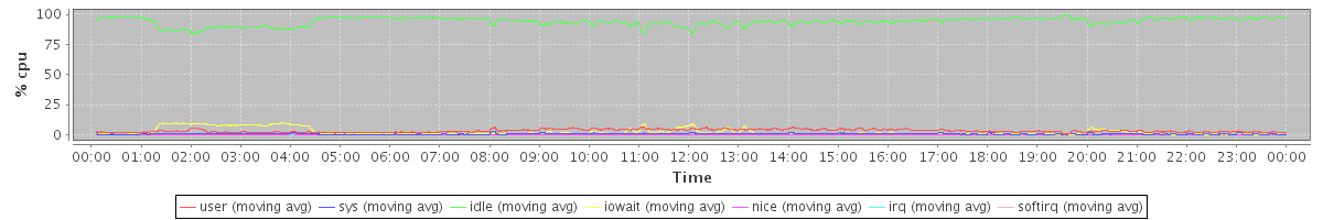 avg(user) = 3.07 avg(sys) = 0.53 avg(idle) = 94.10 avg(iowait) = 2.12 avg(nice) = 0.10 avg(irq) = 0.00 avg(softirq) = 0.07