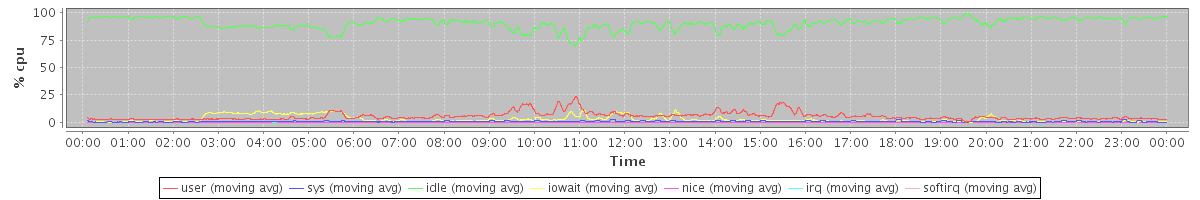 avg(user) = 5.52 avg(sys) = 0.71 avg(idle) = 90.73 avg(iowait) = 2.81 avg(nice) = 0.10 avg(irq) = 0.00 avg(softirq) = 0.13