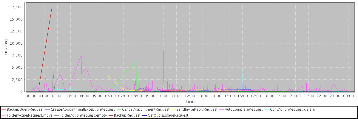 avg(BackupQueryRequest) = 226.40 avg(CreateAppointmentExceptionRequest) = 260.06 avg(CancelAppointmentRequest) = 295.50 avg(SendInviteReplyRequest) = 329.94 avg(AutoCompleteRequest) = 344.66 avg(ConvActionRequest.delete) = 229.11 avg(FolderActionRequest.move) = 306.62 avg(FolderActionRequest.empty) = 393.63 avg(BackupRequest) = 9250.50 avg(GetQuotaUsageRequest) = 1423.00