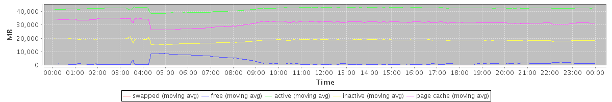 avg(swapped) = 1.38 avg(free) = 2072.24 avg(active) = 42038.61 avg(inactive) = 18366.92 avg(page cache) = 31580.76