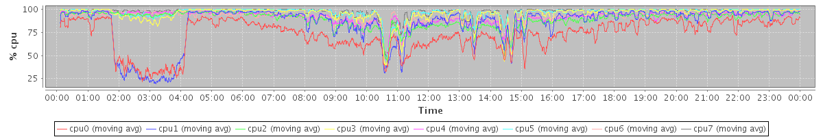 avg(cpu0) = 12.56 avg(cpu1) = 7.68 avg(cpu2) = 0.49 avg(cpu3) = 0.72 avg(cpu4) = 0.33 avg(cpu5) = 0.41 avg(cpu6) = 0.20 avg(cpu7) = 0.11