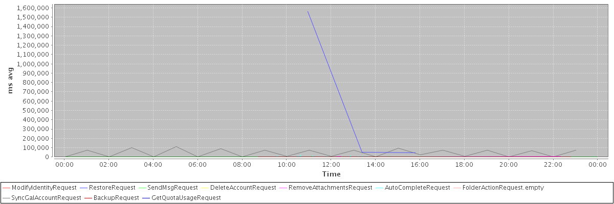 avg(ModifyIdentityRequest) = 268.77 avg(RestoreRequest) = 552998.33 avg(SendMsgRequest) = 225.94 avg(DeleteAccountRequest) = 9447.00 avg(RemoveAttachmentsRequest) = 2299.82 avg(AutoCompleteRequest) = 506.68 avg(FolderActionRequest.empty) = 235.95 avg(SyncGalAccountRequest) = 43505.96 avg(BackupRequest) = 932.00 avg(GetQuotaUsageRequest) = 1329.00