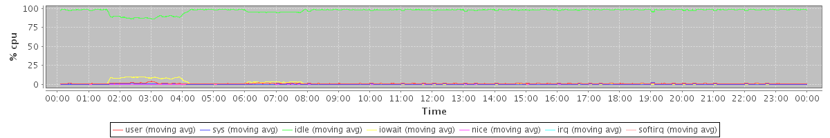 avg(user) = 1.13 avg(sys) = 0.28 avg(idle) = 97.15 avg(iowait) = 1.33 avg(nice) = 0.10 avg(irq) = 0.00 avg(softirq) = 0.02