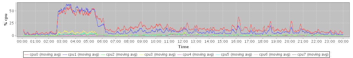 avg(cpu0) = 16.85 avg(cpu1) = 12.24 avg(cpu2) = 0.88 avg(cpu3) = 1.32 avg(cpu4) = 0.49 avg(cpu5) = 0.58 avg(cpu6) = 0.53 avg(cpu7) = 0.30