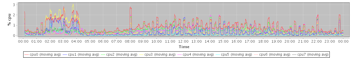 avg(cpu0) = 11.79 avg(cpu1) = 0.77 avg(cpu2) = 0.37 avg(cpu3) = 7.56 avg(cpu4) = 0.19 avg(cpu5) = 0.22 avg(cpu6) = 0.05 avg(cpu7) = 0.27