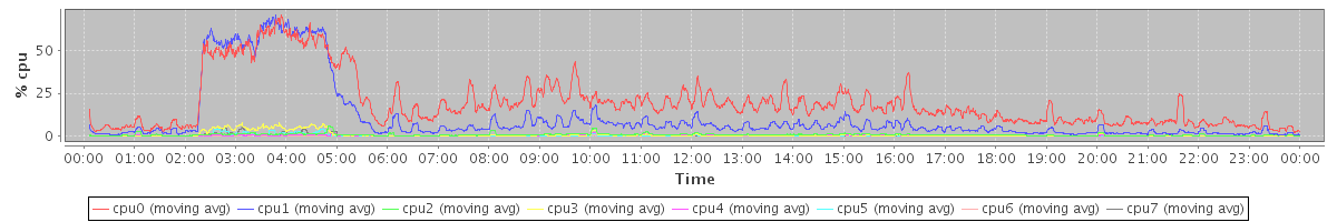 avg(cpu0) = 19.49 avg(cpu1) = 10.66 avg(cpu2) = 0.62 avg(cpu3) = 0.64 avg(cpu4) = 0.22 avg(cpu5) = 0.21 avg(cpu6) = 0.09 avg(cpu7) = 0.17