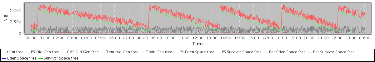 avg(total free) = 3617.17 avg(PS Old Gen free) = 0.00 avg(CMS Old Gen free) = 2704.69 avg(Tenured Gen free) = 0.00 avg(Train Gen free) = 0.00 avg(PS Eden Space free) = 0.00 avg(PS Survivor Space free) = 0.00 avg(Par Eden Space free) = 798.46 avg(Par Survivor Space free) = 114.02 avg(Eden Space free) = 0.00 avg(Survivor Space free) = 0.00