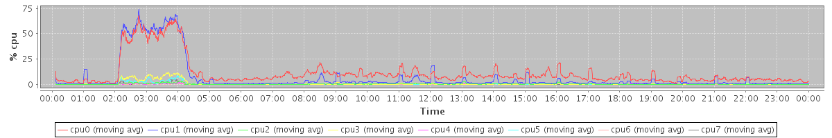 avg(cpu0) = 11.09 avg(cpu1) = 6.95 avg(cpu2) = 0.36 avg(cpu3) = 0.72 avg(cpu4) = 0.23 avg(cpu5) = 0.40 avg(cpu6) = 0.10 avg(cpu7) = 0.16