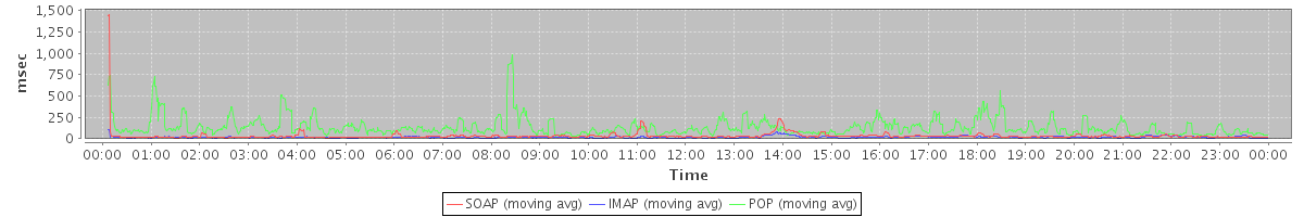 avg(FolderActionRequest.sync) = 8647.00 avg(SendMsgRequest) = 349.08 avg(DeleteAccountRequest) = 6139.67 avg(BackupQueryRequest) = 470.40 avg(RemoveAttachmentsRequest) = 1141.75 avg(AutoCompleteRequest) = 420.43 avg(ApplyFilterRulesRequest) = 29744.13 avg(SyncGalAccountRequest) = 50089.96 avg(BackupRequest) = 780.00 avg(GetQuotaUsageRequest) = 1434.00