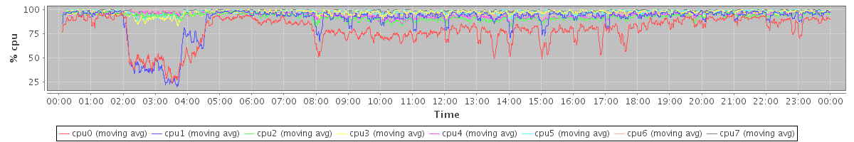avg(cpu0) = 78.66 avg(cpu1) = 89.00 avg(cpu2) = 92.60 avg(cpu3) = 96.64 avg(cpu4) = 94.09 avg(cpu5) = 97.39 avg(cpu6) = 96.31 avg(cpu7) = 98.15