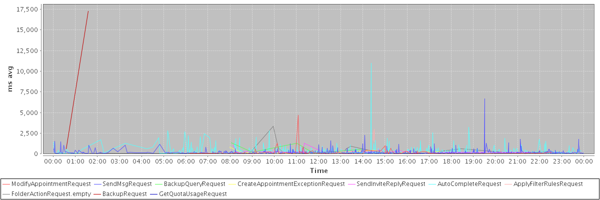 avg(ModifyAppointmentRequest) = 208.05 avg(SendMsgRequest) = 178.30 avg(BackupQueryRequest) = 702.20 avg(CreateAppointmentExceptionRequest) = 266.22 avg(SendInviteReplyRequest) = 306.15 avg(AutoCompleteRequest) = 318.65 avg(ApplyFilterRulesRequest) = 2190.25 avg(FolderActionRequest.empty) = 458.00 avg(BackupRequest) = 8940.50 avg(GetQuotaUsageRequest) = 3014.00