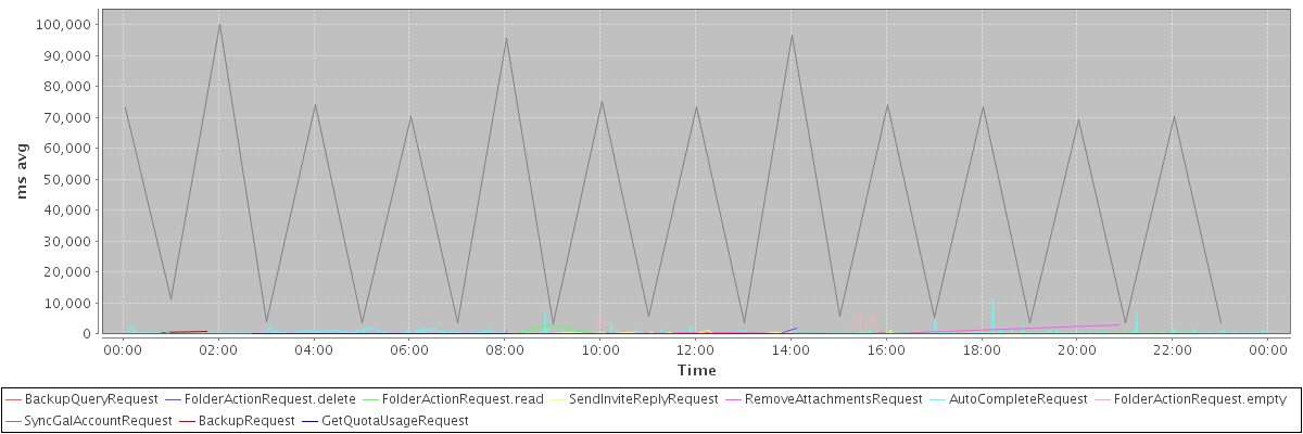 avg(BackupQueryRequest) = 253.60 avg(FolderActionRequest.delete) = 343.00 avg(FolderActionRequest.read) = 399.62 avg(SendInviteReplyRequest) = 224.47 avg(RemoveAttachmentsRequest) = 642.25 avg(AutoCompleteRequest) = 324.98 avg(FolderActionRequest.empty) = 483.98 avg(SyncGalAccountRequest) = 41776.83 avg(BackupRequest) = 572.50 avg(GetQuotaUsageRequest) = 1392.00