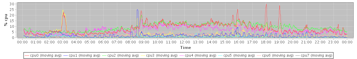 avg(cpu0) = 11.52 avg(cpu1) = 0.83 avg(cpu2) = 0.49 avg(cpu3) = 7.53 avg(cpu4) = 0.33 avg(cpu5) = 0.24 avg(cpu6) = 0.09 avg(cpu7) = 0.12