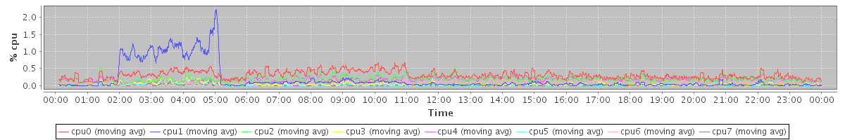 avg(cpu0) = 1.09 avg(cpu1) = 0.86 avg(cpu2) = 0.71 avg(cpu3) = 0.44 avg(cpu4) = 0.61 avg(cpu5) = 0.36 avg(cpu6) = 0.44 avg(cpu7) = 0.30