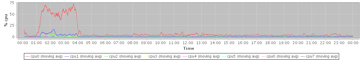 avg(cpu0) = 9.38 avg(cpu1) = 1.01 avg(cpu2) = 0.29 avg(cpu3) = 0.24 avg(cpu4) = 0.16 avg(cpu5) = 0.06 avg(cpu6) = 0.09 avg(cpu7) = 0.03