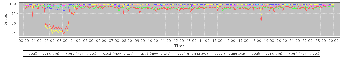 avg(cpu0) = 8.89 avg(cpu1) = 0.69 avg(cpu2) = 0.31 avg(cpu3) = 5.96 avg(cpu4) = 0.14 avg(cpu5) = 0.19 avg(cpu6) = 0.03 avg(cpu7) = 0.08