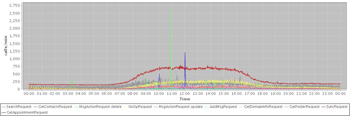 max(SearchRequest) = 190.00 max(GetContactsRequest) = 439.00 max(MsgActionRequest.delete) = 2718.00 max(NoOpRequest) = 354.00 max(MsgActionRequest.update) = 121.00 max(AddMsgRequest) = 177.00 max(GetDomainInfoRequest) = 154.00 max(GetFolderRequest) = 473.00 max(SyncRequest) = 798.00 max(GetAppointmentRequest) = 1213.00