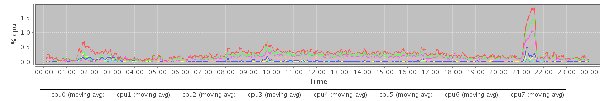 avg(cpu0) = 1.04 avg(cpu1) = 0.46 avg(cpu2) = 0.73 avg(cpu3) = 0.31 avg(cpu4) = 0.61 avg(cpu5) = 0.24 avg(cpu6) = 0.38 avg(cpu7) = 0.25