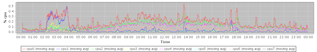 avg(cpu0) = 0.18 avg(cpu1) = 0.04 avg(cpu2) = 0.12 avg(cpu3) = 0.01 avg(cpu4) = 0.10 avg(cpu5) = 0.01 avg(cpu6) = 0.04 avg(cpu7) = 0.00