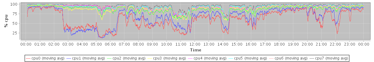 avg(cpu0) = 1.39 avg(cpu1) = 1.38 avg(cpu2) = 0.95 avg(cpu3) = 0.85 avg(cpu4) = 0.74 avg(cpu5) = 0.66 avg(cpu6) = 0.83 avg(cpu7) = 0.49
