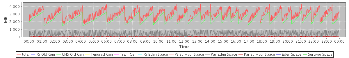 avg(total) = 2995.21 avg(PS Old Gen) = 0.00 avg(CMS Old Gen) = 2444.98 avg(Tenured Gen) = 0.00 avg(Train Gen) = 0.00 avg(PS Eden Space) = 0.00 avg(PS Survivor Space) = 0.00 avg(Par Eden Space) = 481.70 avg(Par Survivor Space) = 68.54 avg(Eden Space) = 0.00 avg(Survivor Space) = 0.00