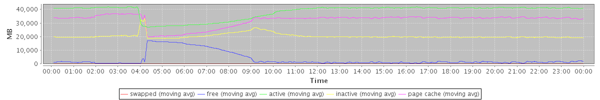 avg(swapped) = 10.59 avg(free) = 3423.66 avg(active) = 38358.04 avg(inactive) = 20450.19 avg(page cache) = 32096.17