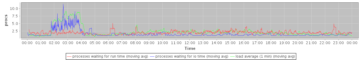 avg(processes waiting for run time) = 1.25 avg(processes waiting for io time) = 0.72 avg(load average (1 min)) = 2.27