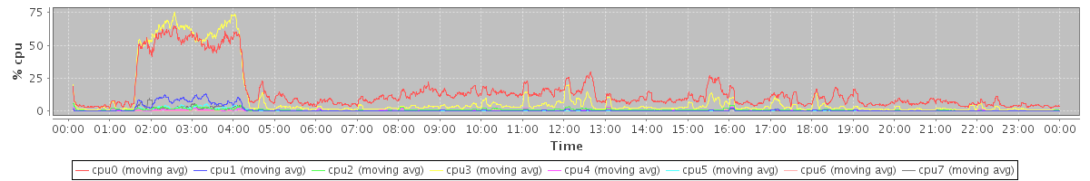 avg(cpu0) = 14.11 avg(cpu1) = 0.91 avg(cpu2) = 0.64 avg(cpu3) = 9.25 avg(cpu4) = 0.39 avg(cpu5) = 0.30 avg(cpu6) = 0.11 avg(cpu7) = 0.32