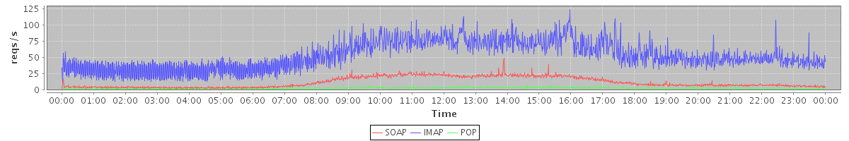 Host zm03.stanford.edu: Mailboxd: Request Rate by Client Protocol