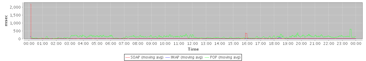 avg(DeleteAccountRequest) = 3702.00 avg(BackupQueryRequest) = 499.80 avg(CreateAppointmentExceptionRequest) = 511.50 avg(ConvActionRequest.read) = 631.08 avg(FolderActionRequest.read) = 995.33 avg(SendInviteReplyRequest) = 5041.85 avg(RemoveAttachmentsRequest) = 629.62 avg(FolderActionRequest.empty) = 467.31 avg(BackupRequest) = 10475.50 avg(GetQuotaUsageRequest) = 2619.00