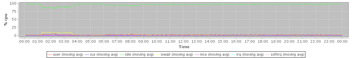 avg(user) = 2.07 avg(sys) = 0.39 avg(idle) = 95.89 avg(iowait) = 1.50 avg(nice) = 0.10 avg(irq) = 0.00 avg(softirq) = 0.02