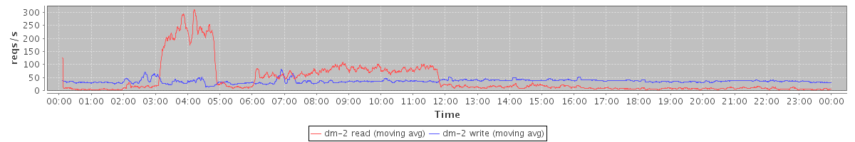 avg(dm-2 read) = 732.97 avg(dm-2 write) = 712.21