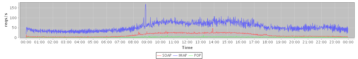 Host zm03.stanford.edu: Mailboxd: Request Rate by Client Protocol