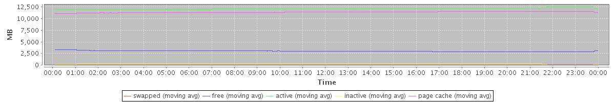 avg(swapped) = 0.22 avg(free) = 3013.22 avg(active) = 12128.95 avg(inactive) = 264.44 avg(page cache) = 11389.09