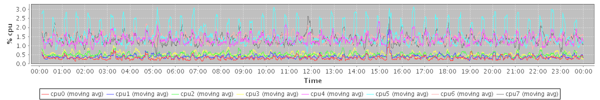avg(cpu0) = 0.33 avg(cpu1) = 0.40 avg(cpu2) = 0.51 avg(cpu3) = 0.52 avg(cpu4) = 1.34 avg(cpu5) = 1.61 avg(cpu6) = 1.48 avg(cpu7) = 1.37