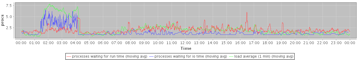 avg(processes waiting for run time) = 1.33 avg(processes waiting for io time) = 0.67 avg(load average (1 min)) = 2.28