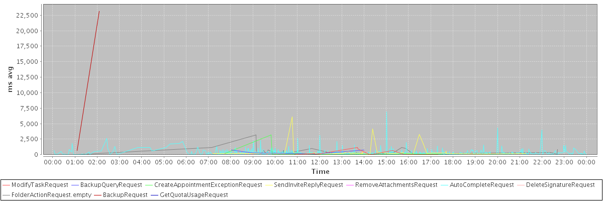 avg(ModifyTaskRequest) = 235.43 avg(BackupQueryRequest) = 406.00 avg(CreateAppointmentExceptionRequest) = 235.55 avg(SendInviteReplyRequest) = 493.56 avg(RemoveAttachmentsRequest) = 1002.00 avg(AutoCompleteRequest) = 303.36 avg(DeleteSignatureRequest) = 215.67 avg(FolderActionRequest.empty) = 427.35 avg(BackupRequest) = 11922.00 avg(GetQuotaUsageRequest) = 3350.00