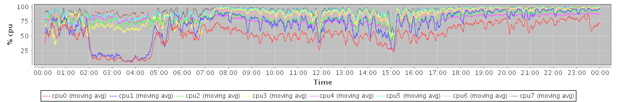 avg(cpu0) = 16.29 avg(cpu1) = 11.74 avg(cpu2) = 2.55 avg(cpu3) = 2.51 avg(cpu4) = 1.67 avg(cpu5) = 1.20 avg(cpu6) = 0.94 avg(cpu7) = 0.59