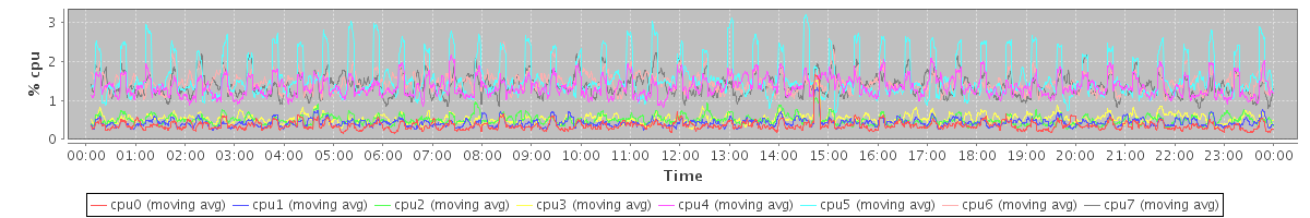 avg(cpu0) = 0.36 avg(cpu1) = 0.43 avg(cpu2) = 0.50 avg(cpu3) = 0.53 avg(cpu4) = 1.35 avg(cpu5) = 1.60 avg(cpu6) = 1.47 avg(cpu7) = 1.38