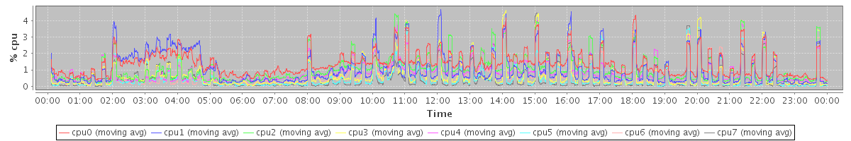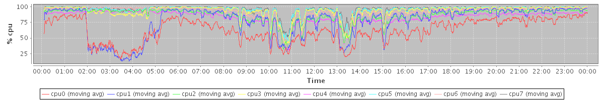 avg(cpu0) = 1.36 avg(cpu1) = 1.04 avg(cpu2) = 1.05 avg(cpu3) = 0.70 avg(cpu4) = 0.90 avg(cpu5) = 0.58 avg(cpu6) = 0.70 avg(cpu7) = 0.54