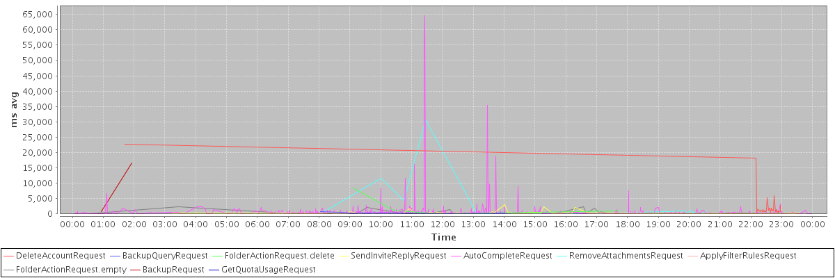 avg(DeleteAccountRequest) = 2185.39 avg(BackupQueryRequest) = 332.40 avg(FolderActionRequest.delete) = 2159.80 avg(SendInviteReplyRequest) = 389.57 avg(AutoCompleteRequest) = 675.46 avg(RemoveAttachmentsRequest) = 3770.14 avg(ApplyFilterRulesRequest) = 8261.00 avg(FolderActionRequest.empty) = 403.07 avg(BackupRequest) = 8690.00 avg(GetQuotaUsageRequest) = 3518.00
