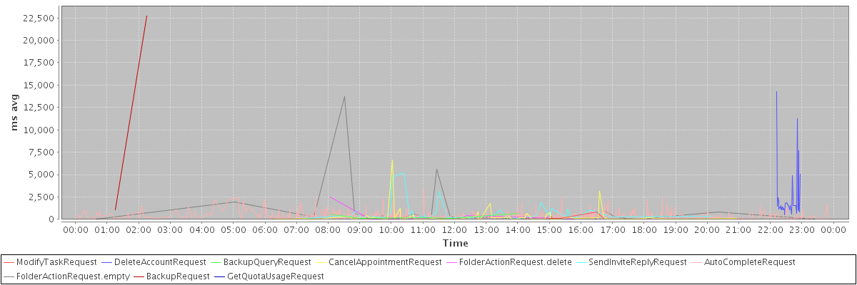 avg(ModifyTaskRequest) = 300.75 avg(DeleteAccountRequest) = 2335.22 avg(BackupQueryRequest) = 329.80 avg(CancelAppointmentRequest) = 301.84 avg(FolderActionRequest.delete) = 509.83 avg(SendInviteReplyRequest) = 615.82 avg(AutoCompleteRequest) = 375.73 avg(FolderActionRequest.empty) = 882.06 avg(BackupRequest) = 11892.50 avg(GetQuotaUsageRequest) = 2701.00