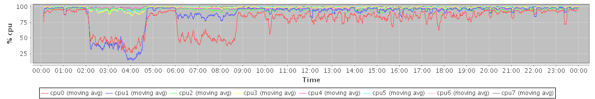 avg(cpu0) = 78.29 avg(cpu1) = 88.21 avg(cpu2) = 95.78 avg(cpu3) = 98.32 avg(cpu4) = 96.60 avg(cpu5) = 98.85 avg(cpu6) = 98.23 avg(cpu7) = 99.37
