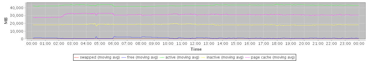 avg(swapped) = 33.39 avg(free) = 1132.93 avg(active) = 43010.66 avg(inactive) = 18325.75 avg(page cache) = 30925.36