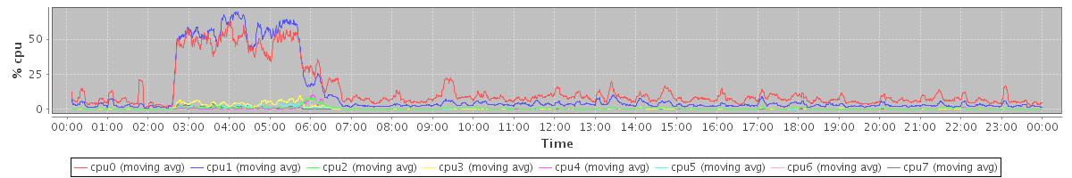 avg(cpu0) = 1.14 avg(cpu1) = 1.10 avg(cpu2) = 0.72 avg(cpu3) = 0.62 avg(cpu4) = 0.54 avg(cpu5) = 0.44 avg(cpu6) = 0.68 avg(cpu7) = 0.40