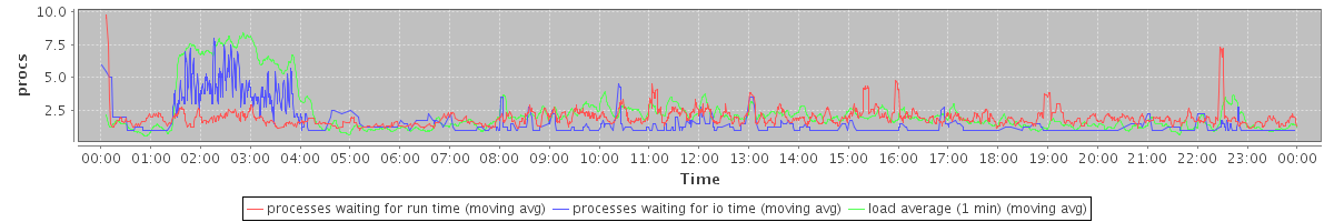 avg(processes waiting for run time) = 1.25 avg(processes waiting for io time) = 0.72 avg(load average (1 min)) = 2.31