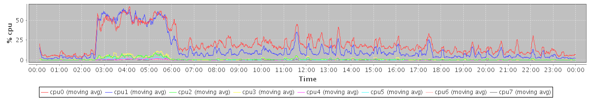 avg(cpu0) = 20.69 avg(cpu1) = 13.97 avg(cpu2) = 1.08 avg(cpu3) = 1.16 avg(cpu4) = 0.41 avg(cpu5) = 0.41 avg(cpu6) = 0.52 avg(cpu7) = 0.10