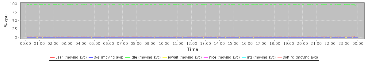 avg(user) = 1.25 avg(sys) = 0.17 avg(idle) = 98.54 avg(iowait) = 0.02 avg(nice) = 0.00 avg(irq) = 0.00 avg(softirq) = 0.00