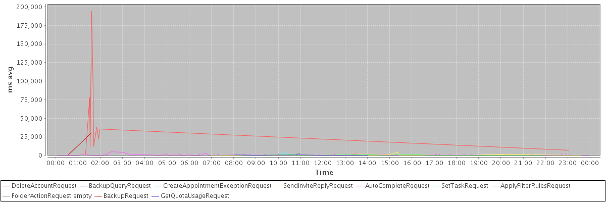 avg(DeleteAccountRequest) = 47050.45 avg(BackupQueryRequest) = 527.60 avg(CreateAppointmentExceptionRequest) = 482.75 avg(SendInviteReplyRequest) = 419.97 avg(AutoCompleteRequest) = 318.20 avg(SetTaskRequest) = 347.33 avg(ApplyFilterRulesRequest) = 2723.29 avg(FolderActionRequest.empty) = 400.50 avg(BackupRequest) = 15432.50 avg(GetQuotaUsageRequest) = 1494.00